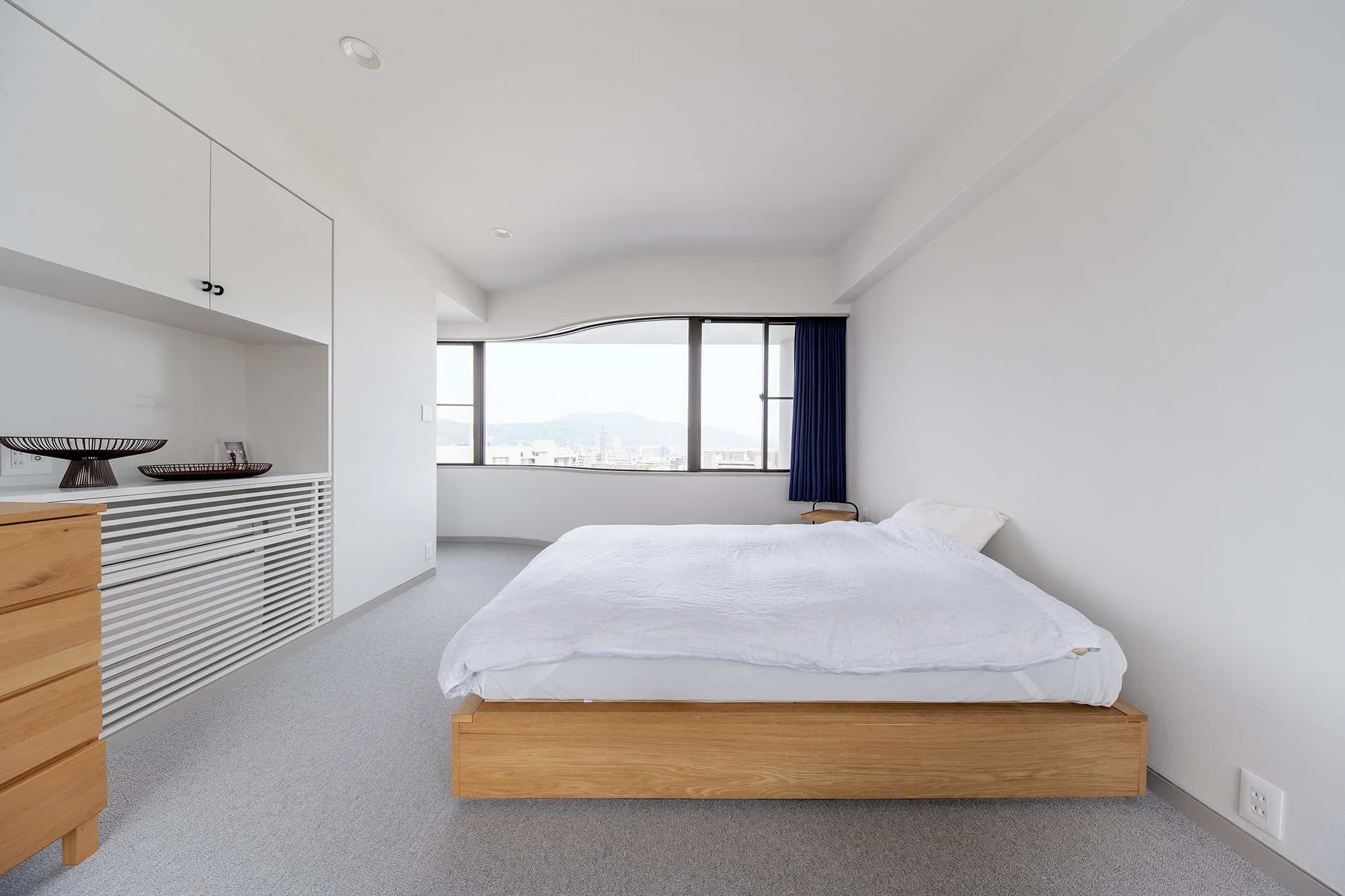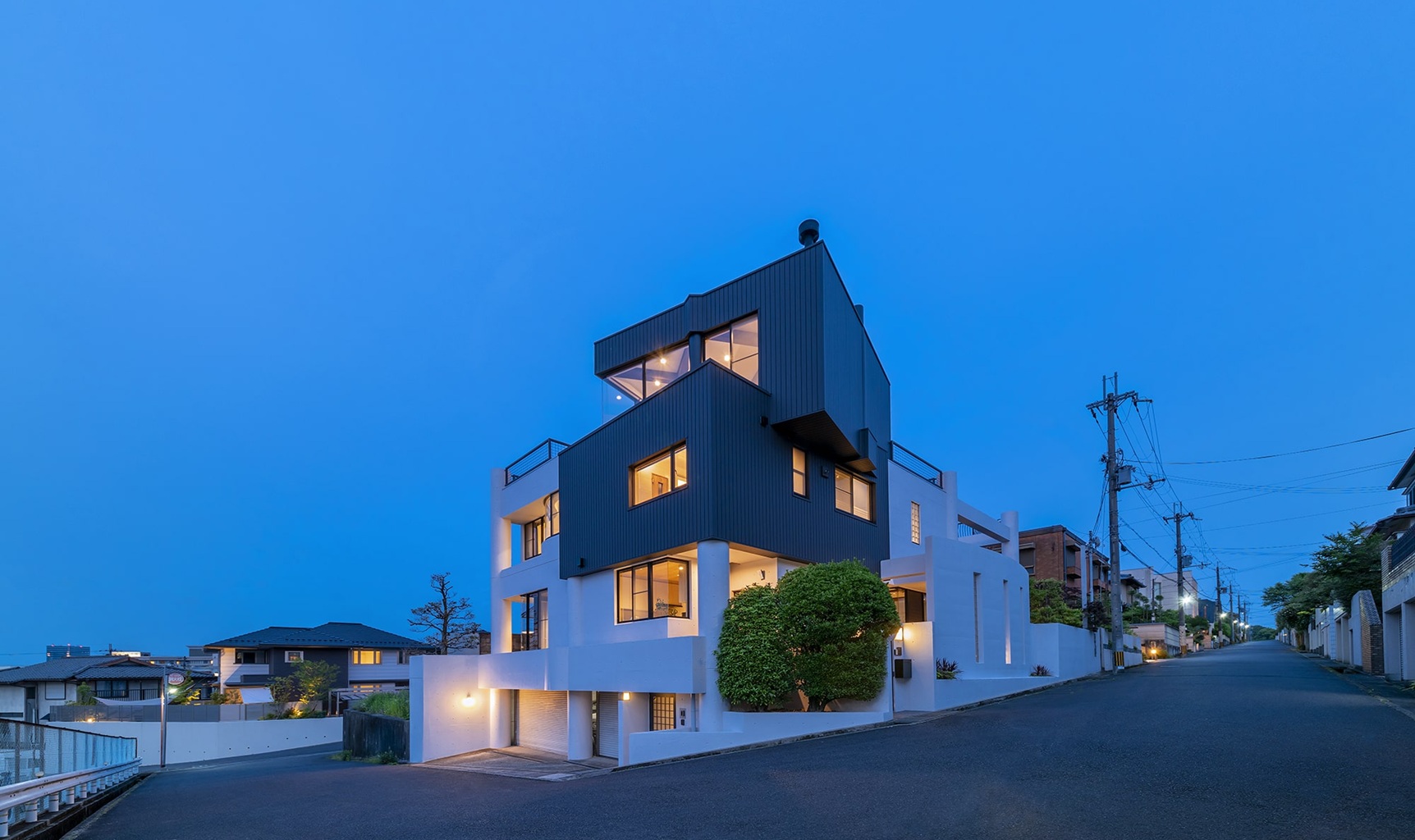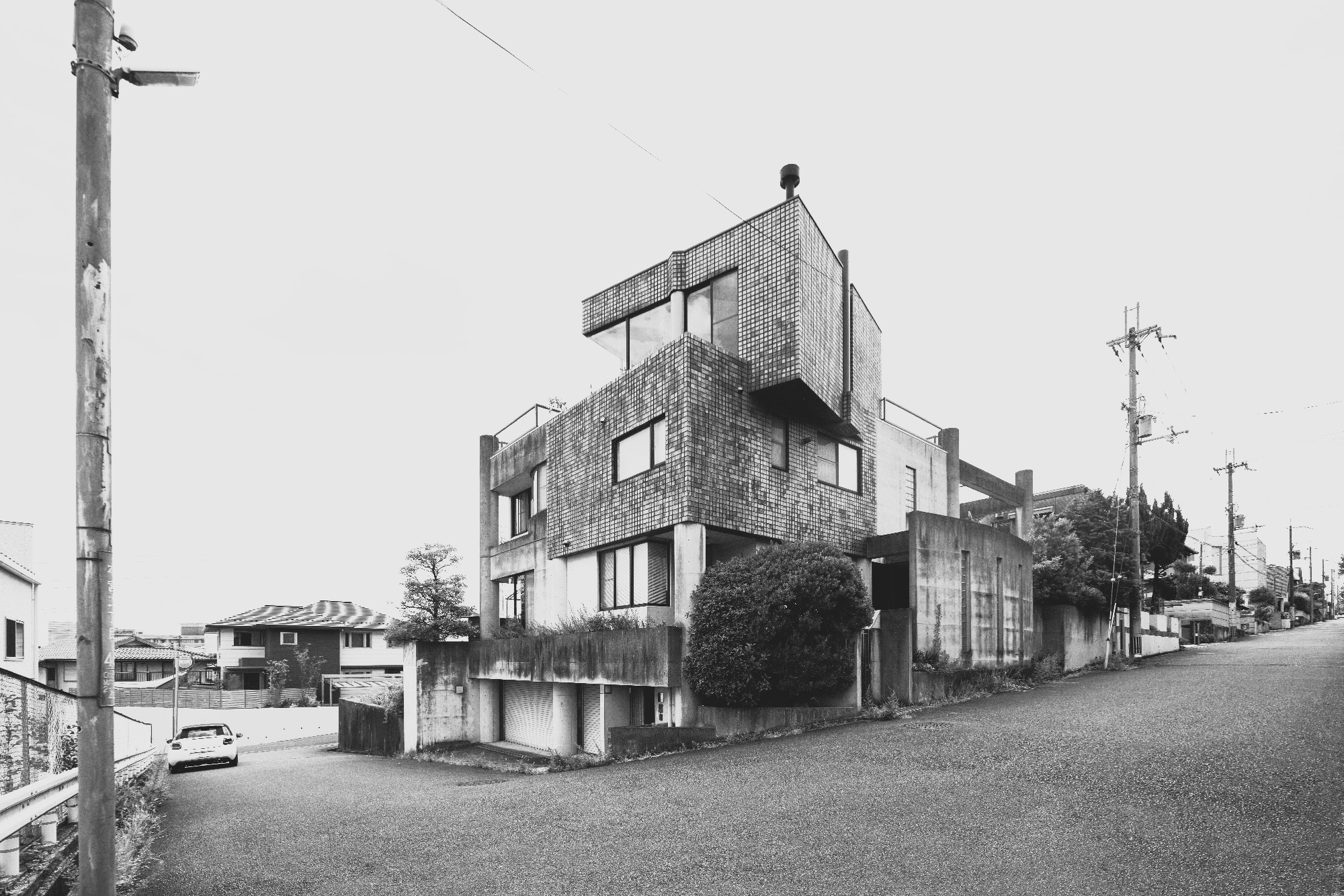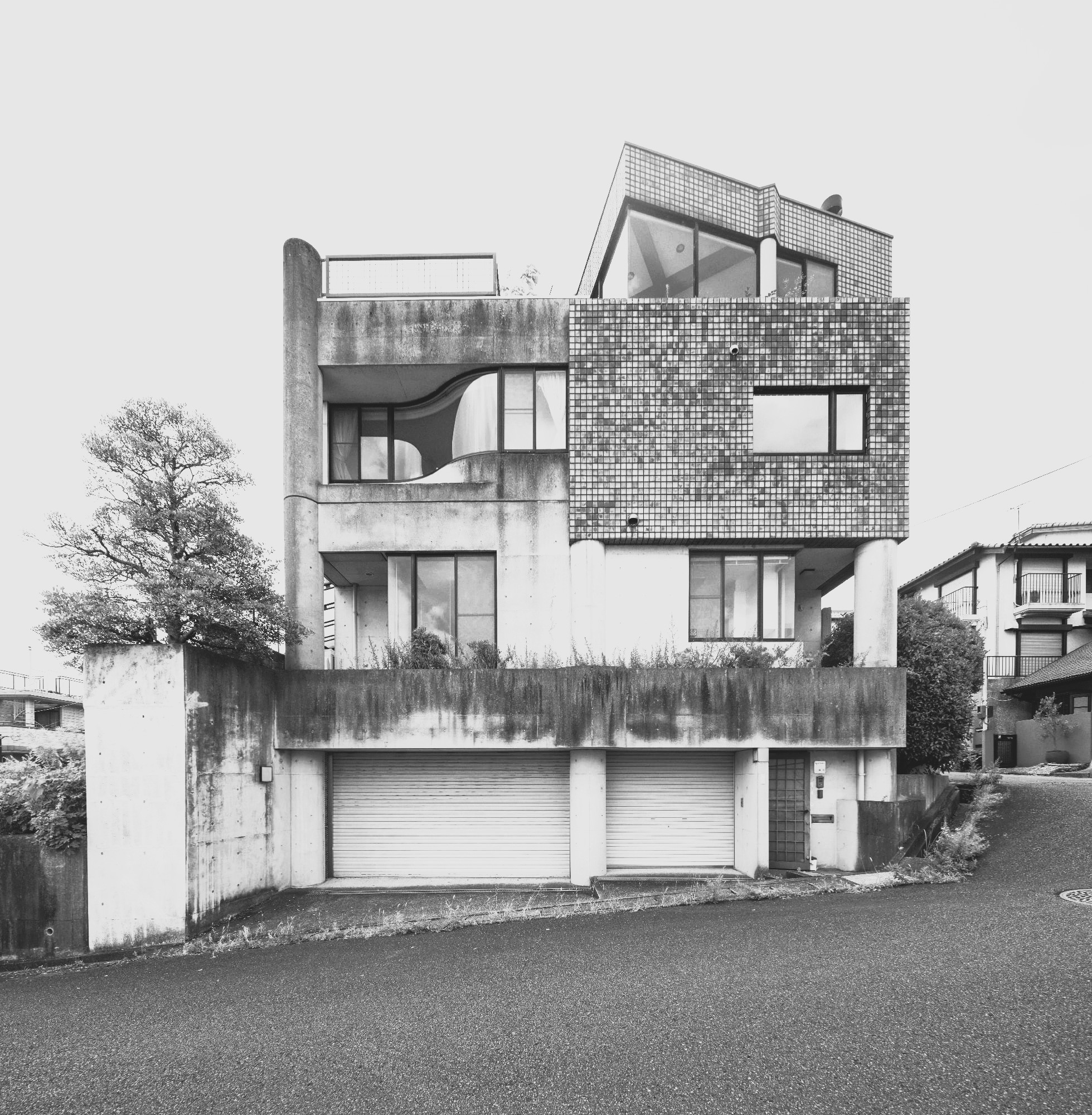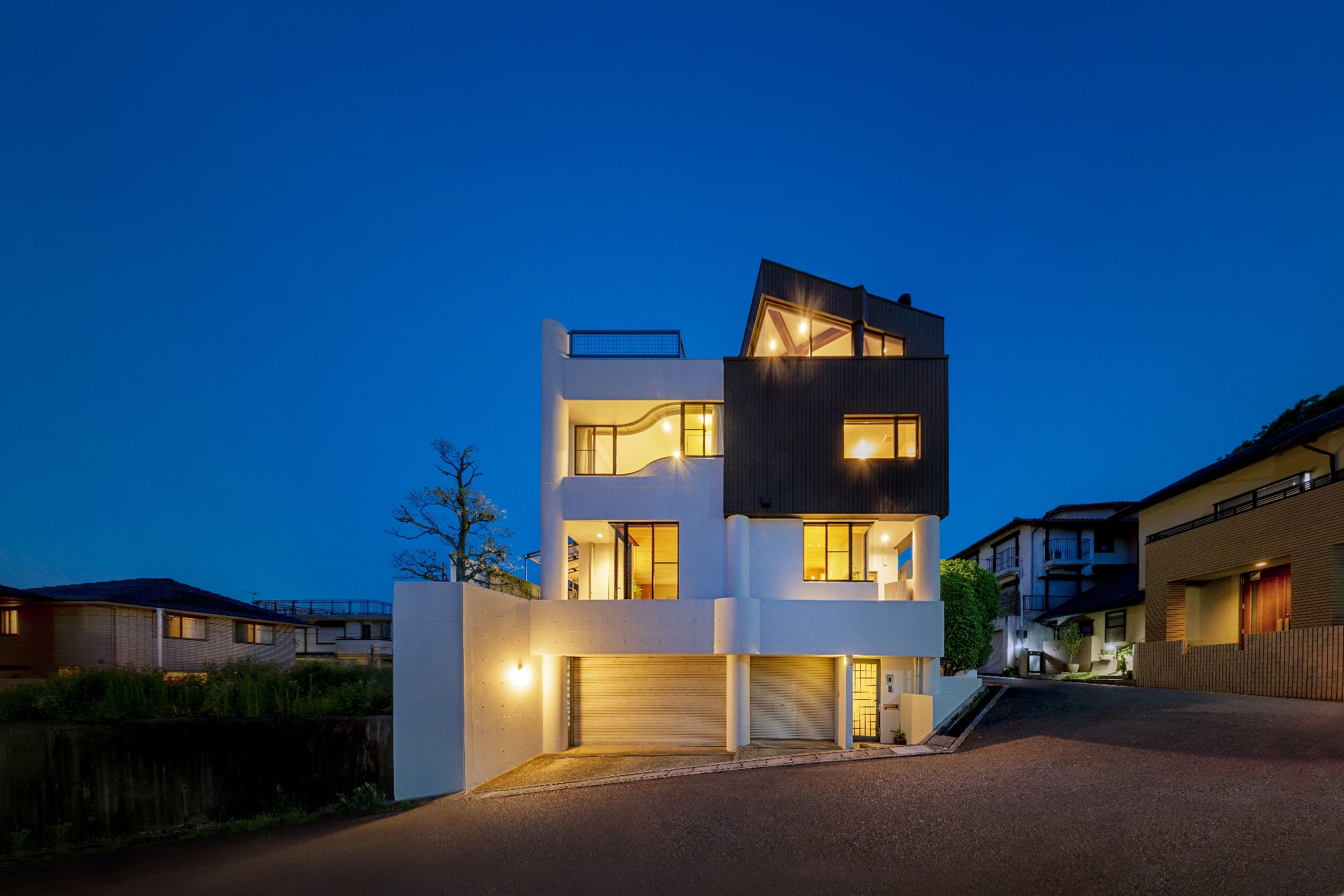 円形の柱と建物の角をリズミカルに組み合わせた外観が個性的な、高台の一軒家。